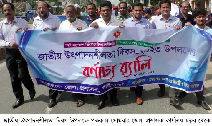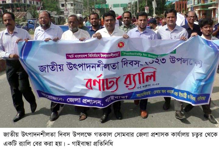 গাইবান্ধা থেকে আঃ খালেক মন্ডলঃ‘স্মার্ট বাংলাদেশ বির্নিমানে উৎপাদনশীলতা’ শীর্ষক শ্লোগানকে সামনে রেখে সোমবার (২ অক্টোবর) গাইবান্ধায় জাতীয় উৎপাদনশীলতা দিবস পালিত হয়েছে। এ উপলক্ষে র্যালি ও আলোচনা সভা অনুষ্ঠিত হয়। র্যালিটি জেলা প্রশাসক কার্যালয় চত্বর থেকে বের হয়ে শহরের প্রধান প্রধান সড়ক প্রদক্ষিণ করে।