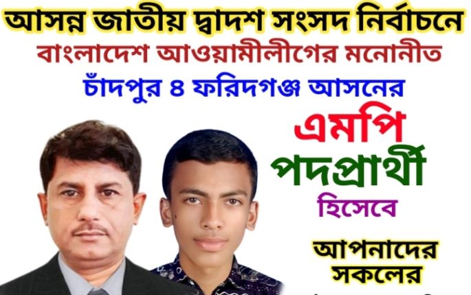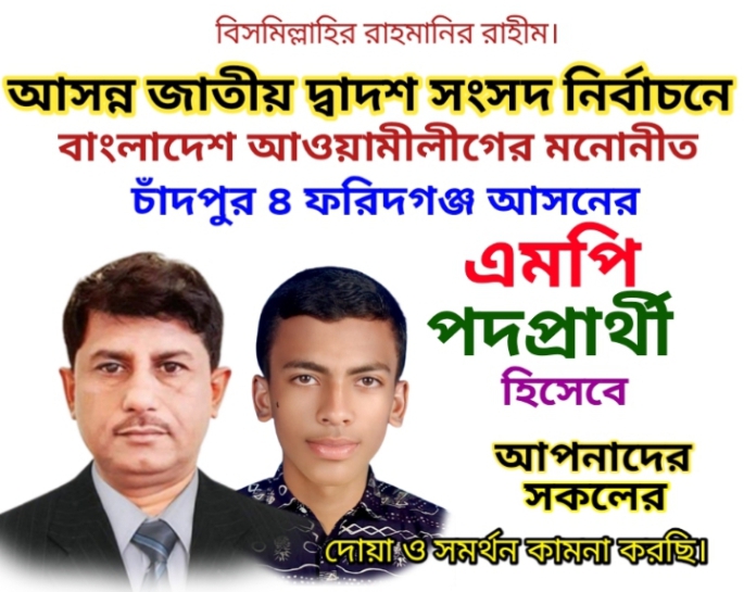 জাতীয় দ্বাদশ সংসদ নির্বাচনে চাঁদপুর ৪ ফরিদগঞ্জ আসনে বাংলাদেশ আওয়ামীলীগের নৌকা মনোনয়ন প্রত্যাশি গরীব দুঃখী মানুষের বন্ধু বিশিষ্ট শিল্পপতি ও দানবীর জনাব জালাল আহমেদ সিআইপি সাহেব।তিনি চায় চাঁদপুর ৪ ফরিদগঞ্জ আসনকে দরিদ্রমুক্ত করে গড়ে তুলতে।তিনি অনবরত নিজ অর্থ্যায়নে গরীব দুঃখী মানুষের সেবায় নিয়োজিত থাকেন। চাঁদপুর ৪ ফরিদগঞ্জ আসনে তিনি গরীব দুঃখী মানুষদেরকে সর্বোচ্ছ সেবা দিয়ে আসছেন।তিনি বলেন আমি সবসময় গরীব দুঃখী মানুষের পাশে আছি থাকবো ইনশাআল্লাহ আপনারাও আমার পাসে থাকবেন এবং আমার জন্য দোয়া করবেন আমি যেন এমপি নির্বাচিত হয়ে আমার এবং দেশের অর্থ্যায়নে আপনাদেরকে আরো বেশি পরিমানে সেবা করতে পারি।